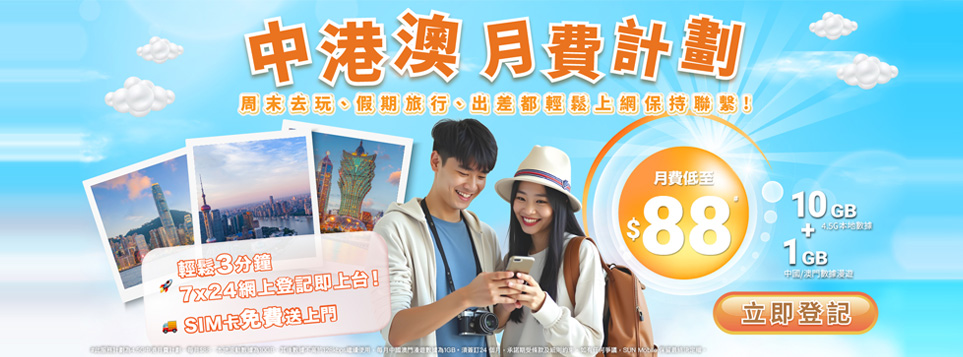 包10GB本地高速數據及1GB中國澳門漫遊數據,覆蓋廣泛,輕鬆連接,立即登記,盡享無憂上網體驗!