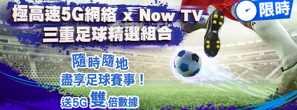 SUN Mobile 5G服務及Now TV 3-pack Soccer Combo,每月$326起,享40GB本地數據及足球精彩賽事直播。立即訂購,盡享高速連接與頂級足球體驗!
